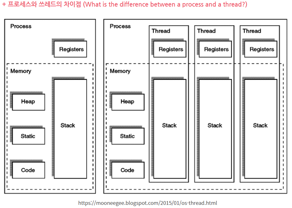 정보나 주소, 자원등을 공유할 수 있다. 스레드가 여러개일 경우 각각 스레드마다 독립적인 스택을