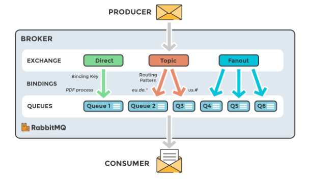 아래 그림을 보면 한번에 이해가 될텐데, direct 나 topic은 큐를 binding 할때 아님 메시지를 보낼때